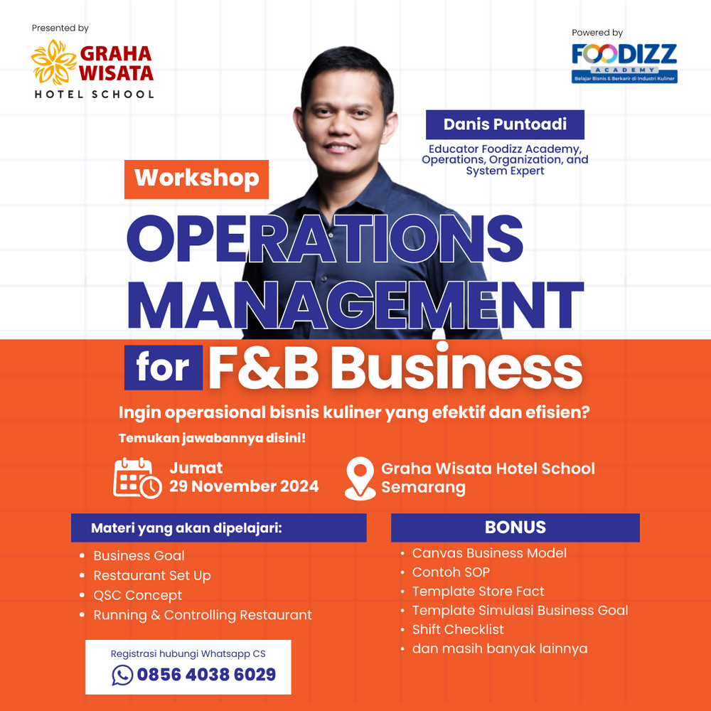 Di Workshop Operations Management for FnB Business, Anda akan belajar dan dibimbing langsung oleh Danis Putoadi educator dari Foodizz Academy yang telah berpengalaman belasan tahun dalam mengelola bisnis kuliner. Disini Anda akan belajar mengenai